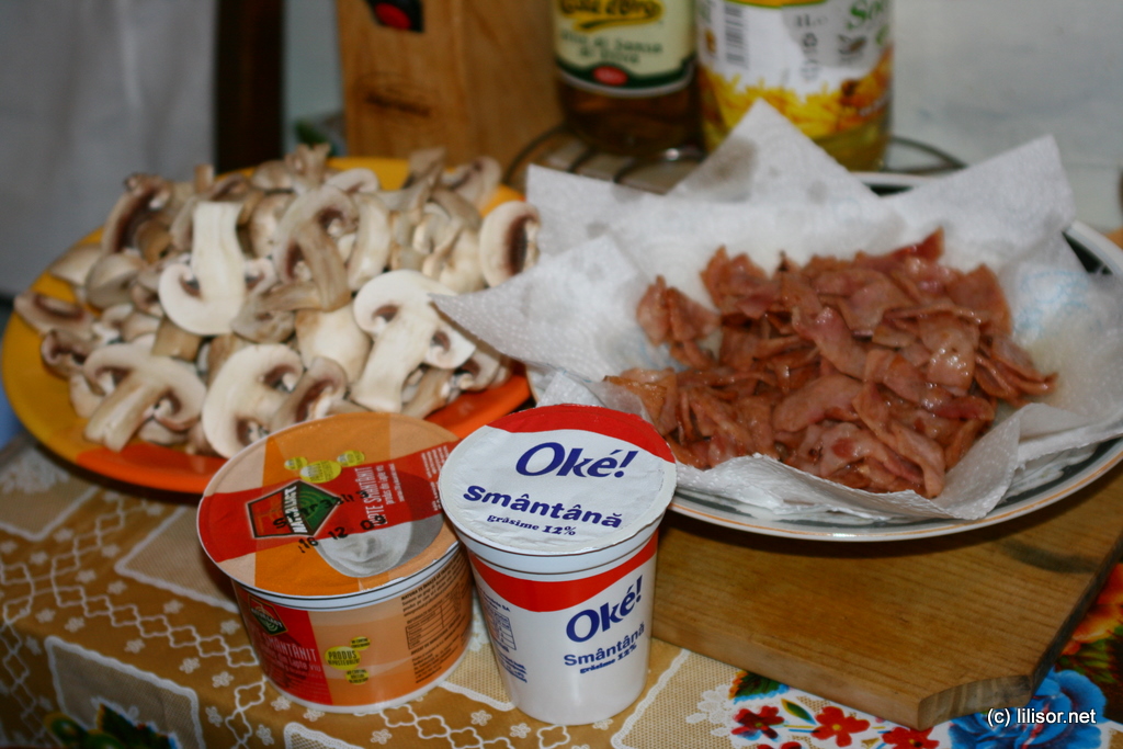 Bun. Ca să rezum povestea pe scurt, am procedat în felul următor: am călit șuncă în o lingură de ulei, am adăugat usturoi și smântână. Între timp, într-o oală separată am călit ciupercile pe care apoi le-am băgat peste șuncă. La final am adaugat spaghetele fierte, frunze mărunțite de pătrunjel și parmezan.