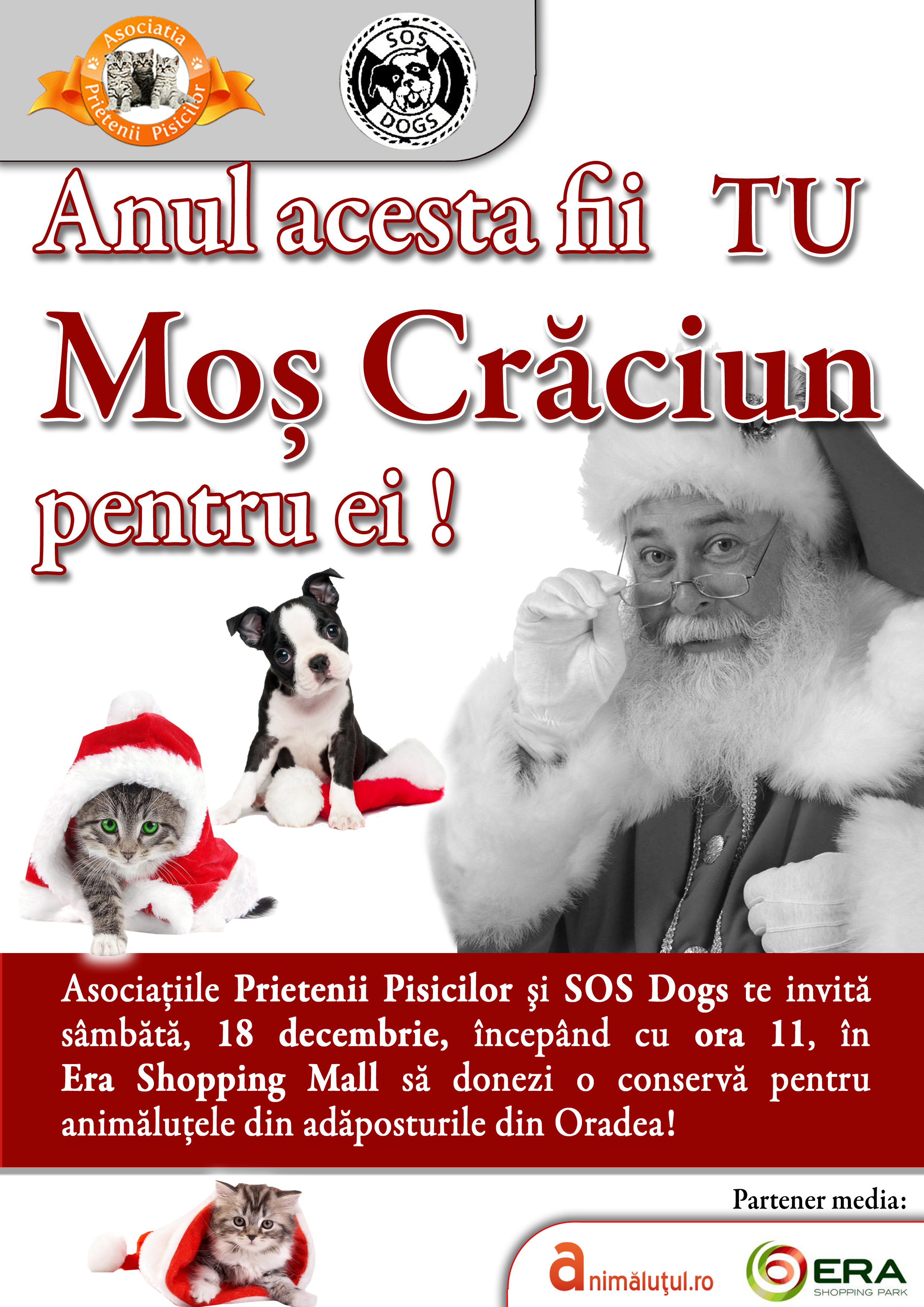 AsociaÅ£iile „Prietenii Pisicilorâ€, „SOS Dogs†Oradea ÅŸi AnimăluÅ£ul.ro vă invită sâmbătă, 18 decembrie 2010, începând cu ora 11 la Era Shopping Park la prima ediÅ£ie a campaniei de strângere de conserve ÅŸi hrană uscată pentru animăluÅ£ele fără stăpân din Oradea.