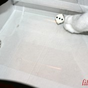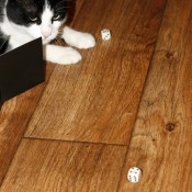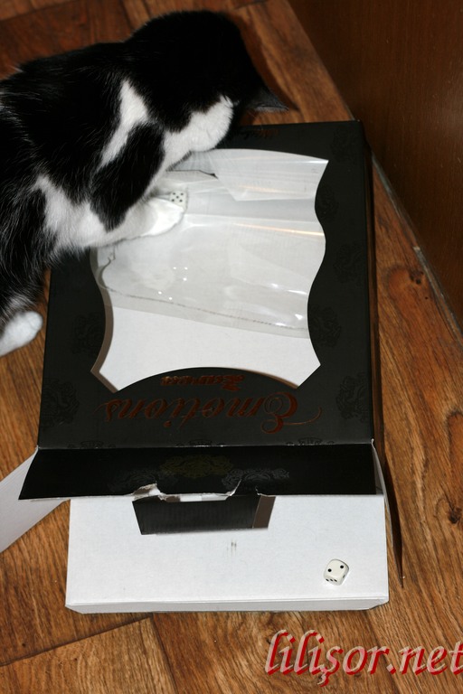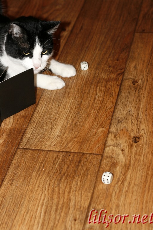 Pentru că n-am vrut să supăr pe nimeni (v-aş fi dat tuturor participanţilor câte-un pinguin), am decis să las pisica să stabilească cine câştigă premiile. Zis şi făcut! Am luat zarurile de la Catan şi le-am aruncat într-o cutie, jucăria miorlăitoarei.