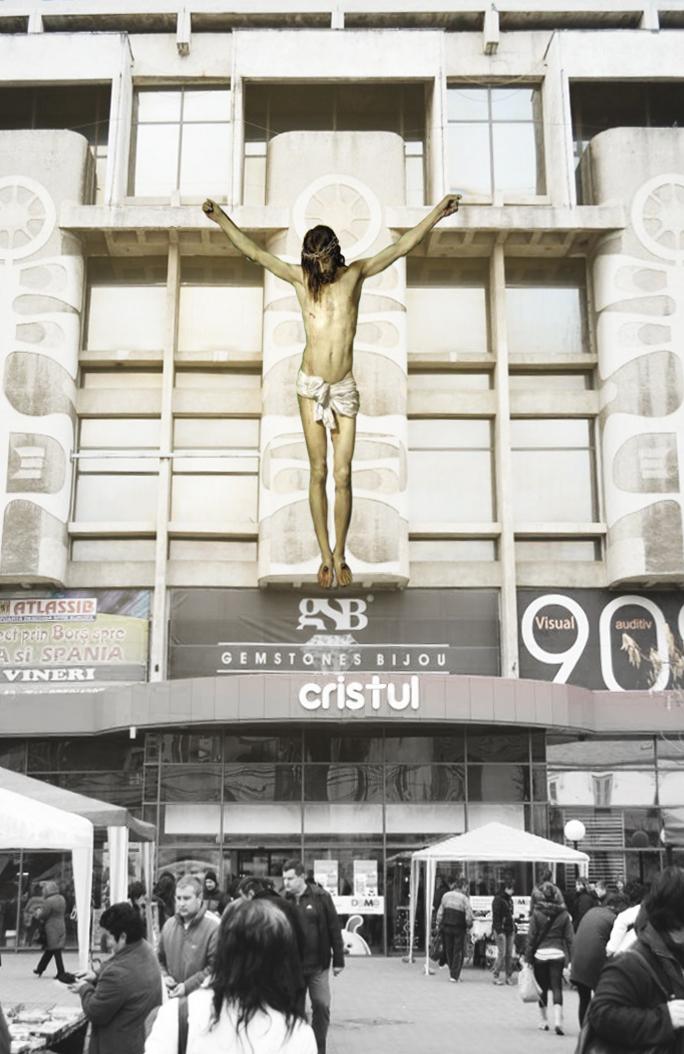 Banuiesc ca daca viziteaza Roma acestor persoane cu o “foarte profunda si serioasa abordare a realitatii” li se face rau de la stomac de atatea simboluri religioase si biserici. Poate e mai frumos la Las Vegas unde nu exista asa ceva si poporul prospera in prostia proprie si investeste dupa bunul plac sau se sinucide, random, fiecare dupa noroc. Sau poate chiar e mai frumos in Coreea de Nord unde omul (si nici intrun caz Dumnezeu) este in centrul universului in toata splendoarea lui de un metru si un shnitzel ridicata la rangul unor statui de 30 de metri spre incintarea ochilor: http://www.mirror.co.uk/news/world-news/north-korea-marks-kim-il-sungs-1834055.Dupa 50 de ani de de-biserificare acum vin niste tineri artisti cu aceeasi idee numai cu altfel aer mai putin stalinist dar mult mai infantil si mai tupeist? Mesajul este gol, in lumea asta exista oameni seriosi care s-au saturat de mintile golite de continut si pline de entuziasm.