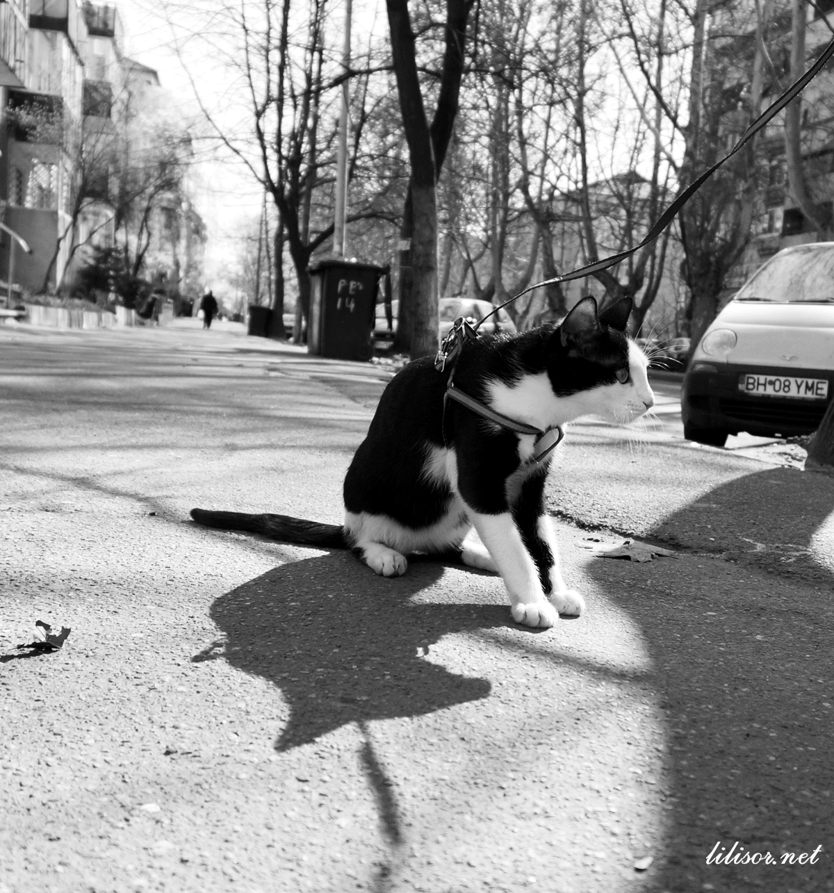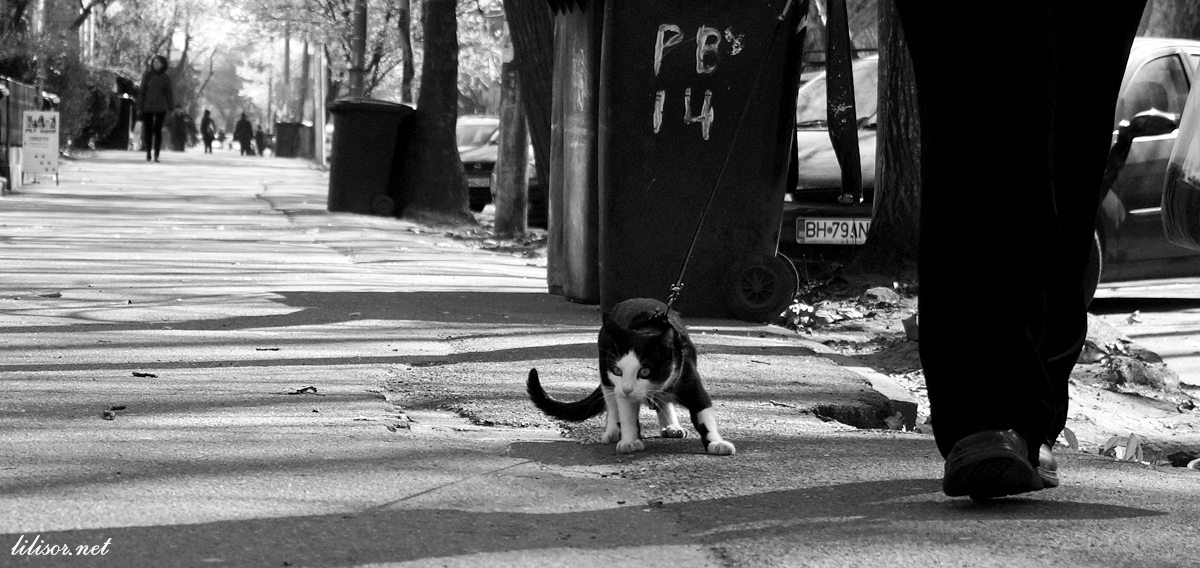 „Noi locuim într-o garsonieră mică, l-am scos în lesă ca să facă un pic de mișcare, să simtă că viața nu înseamnă doar pereții apartamentului”. Vorbea pe un ton apologetic, de parcă i-ar fi fost teamă să n-o judec pentru îndrăzneala de a scoate pisoiul în lesă.